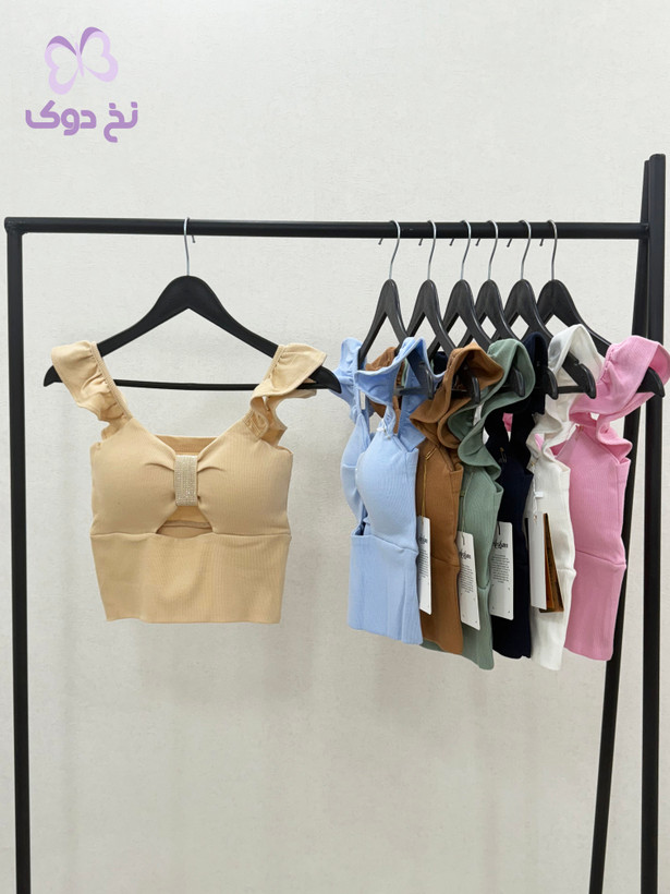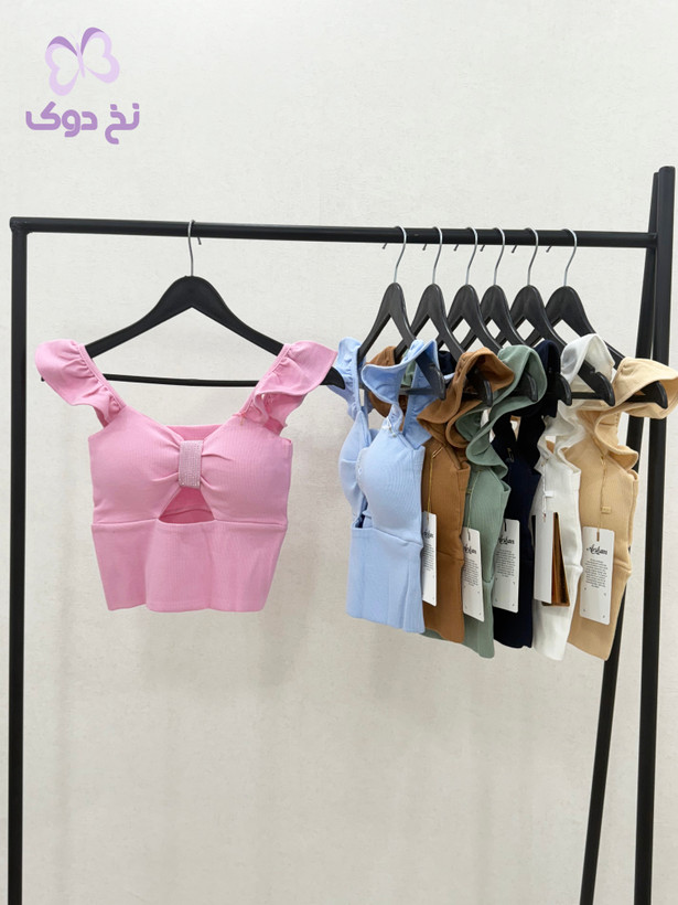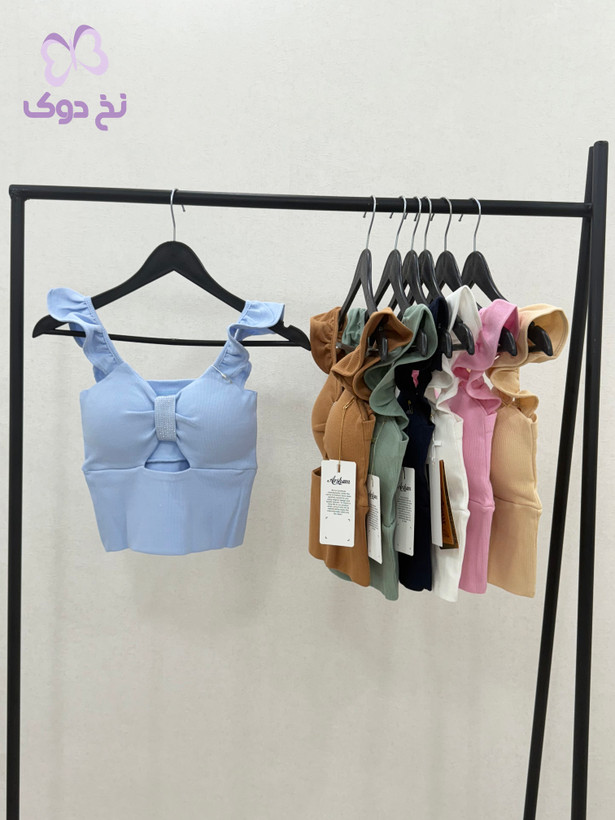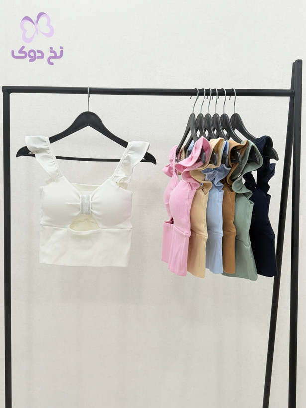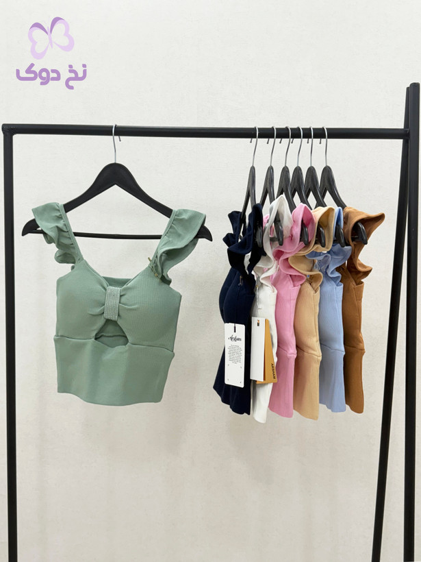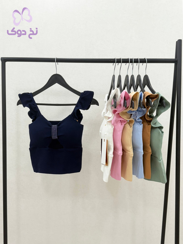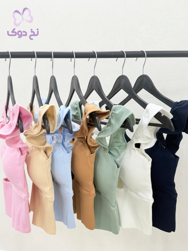 طراحی: یقه دلبری، دارای کاپ داخلی و تزیین نگین در قسمت جلو